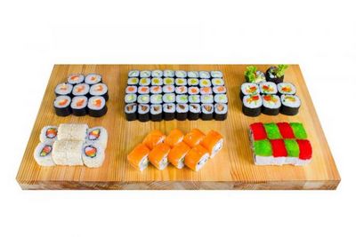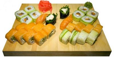 (роллы: Филадельфия, Аляска маки, Такэ суши с водорослями Чука 2 шт.) Вес-1000гр. Цена- 650 руб.