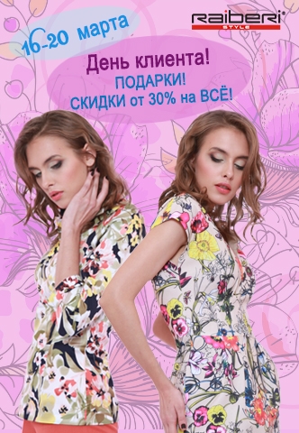 Распродажа для клиентов клуба привилегий ТМ Raiberi Отмечаем День клиента . С 16 по 20 марта скидки от 30% на всё! Подарки!